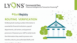 Lyons Commercial Data is the leading source of bank routing number verification and account number validation products and services. Lyons offers an online routing number tool, bank routing number databases, and web services for seamless integration with payment systems.